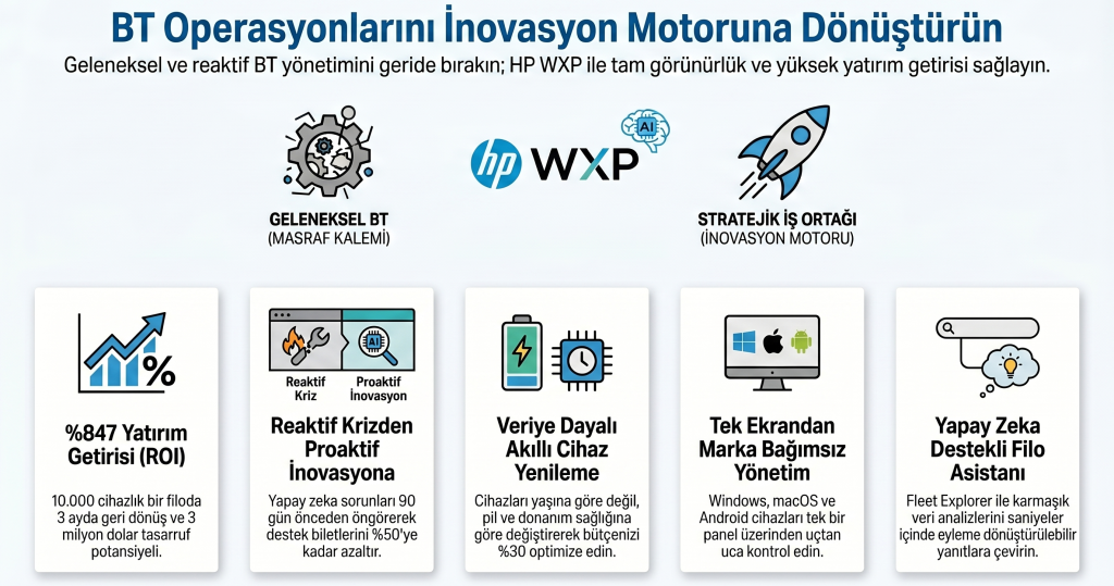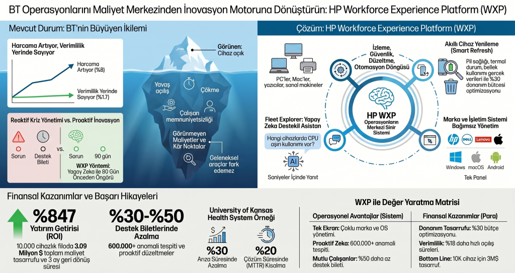 Bugün, dijital çağda iş gücü verimliliği ve çalışan deneyimini bir üst seviyeye taşıyan çözümleri gündemimize taşıyoruz. HP’nin yapay zekâ destekli Workforce Experience Platform (WXP) çözümü, kurumların dijital çalışan deneyimini proaktif biçimde yönetmesine olanak tanır. WXP; analitik veriler, otomasyon, gerçek zamanlı içgörüler ve çalışan memnuniyeti odaklı yaklaşımıyla IT süreçlerini optimize eder, maliyetleri azaltır ve çalışan bağlılığını artırır.